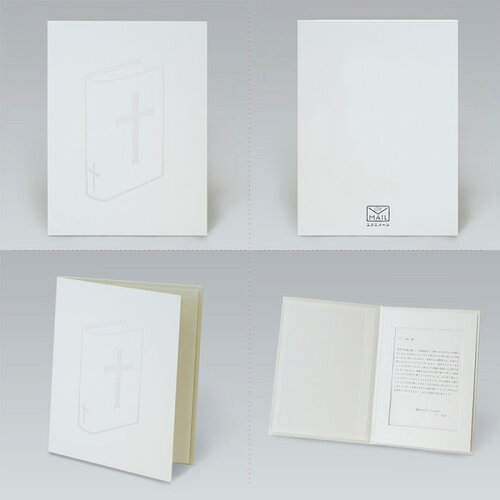 純白の生地にデボス(押し上げ)加工で立体的に描かれた聖書が、神聖な雰囲気を与えるカードです。
